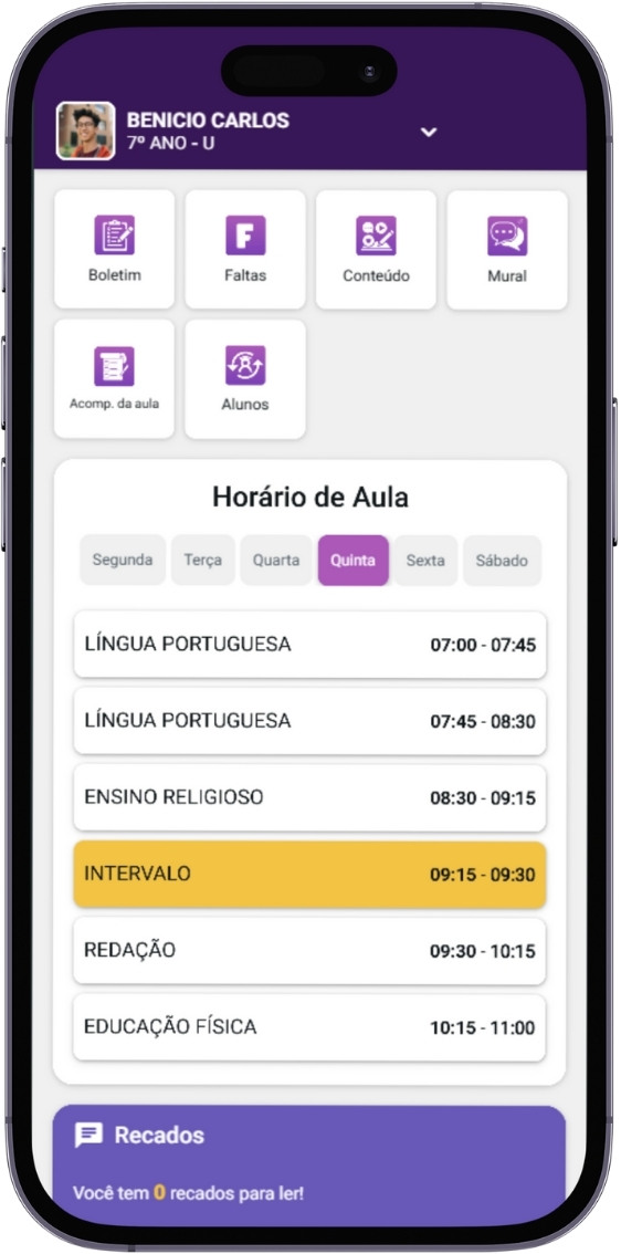 Notas, faltas, horários, conteúdos e comunicados em um único app.